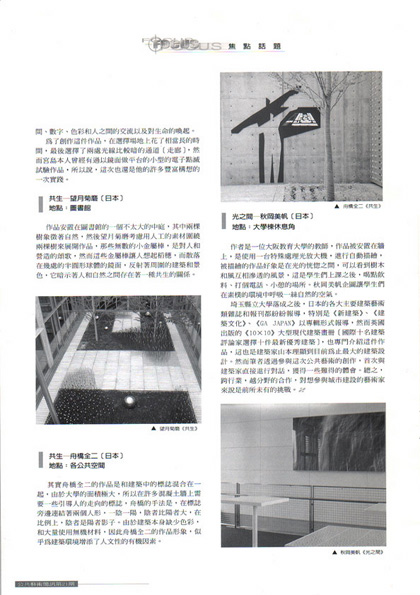 融入透明輕盈的空間ー日本 埼玉縣立大學公共藝術,『公共藝術 簡訊 Public Art NEWSLETTER 第21期』財團法人台北市開放空間文教基金會,2001年3月20日